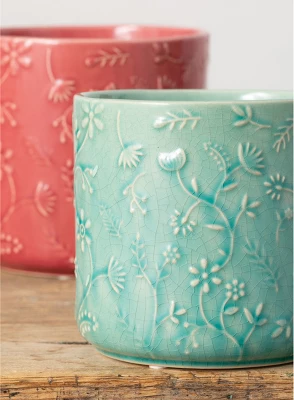 Embossed with a charming floral relief pattern, this colorful ceramic is bound to make a cheerful statement in any surrounding. Gather multiples as a collection, or set about here and there throughout the room, you’ll love the quaint design of these pieces. You can put faux florals and greenery in here or real. Great on a covered patio or entryway.Over the last 55 years, Sullivans has become an industry leader in home decorations. Our brand is rooted in tradition while incorporating modernized trends to keep your home looking up to date with timeless style. Here at Sullivans, we pride ourselves on creating product designs focused on quality and value, ensuring that our customers have access to beautiful products at reasonable price points.